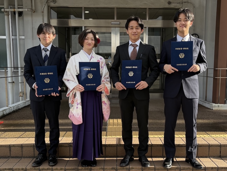 3月26日(木)学部・大学院の学位授与式が執り行われました.研究室からは下記修士2名,学士4名が学位を授与されました(大学院(博士前期課程):畔柳拓郎,財満陽己 学部:出口真弓,伴倫太郎,藤原太一,松田和也).